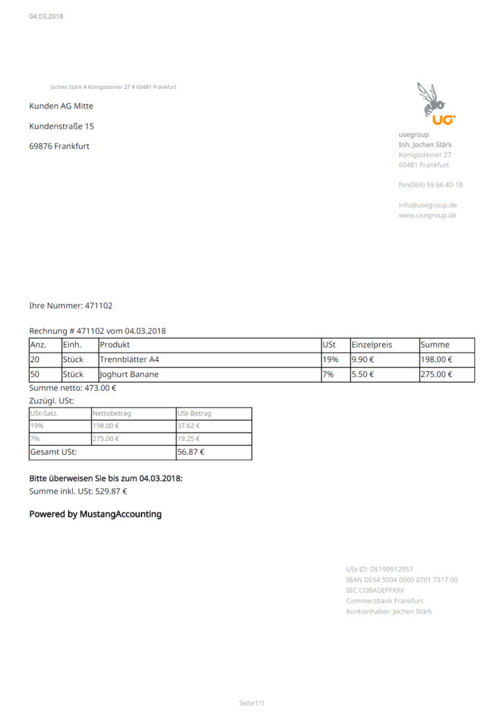 The use of HTML (mustache)-templates makes it possible for customers to offer their users to customize and design the optics of the resulting PDF part of the invoice e.g. using standard embeddable visual live design tools. The feature is further described in the Mustangserver manual.